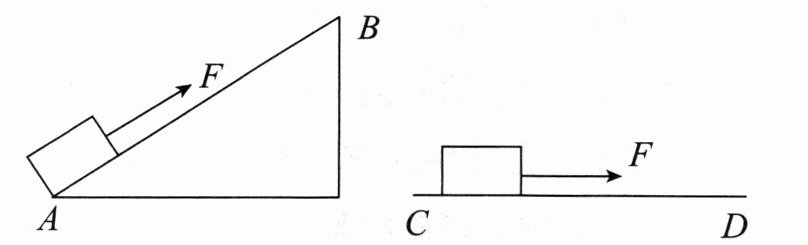 4. 如图所示,用大小相等的拉力 F 分别沿光滑的斜面和粗糙的水平面拉木箱,在力的作用下移动的距离 $ s_{AB}=s_{CD} $,比较两种情况下拉力 F 所做的功及其功率 (