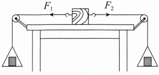 状态时我们认为它受到的力是相互平衡的。(2)实验时,小宇发现当向左盘和右盘同时加入$50g$的砝码时,木块处于静止状态。此时木块在水平方向上受到两个力,这两个力是平衡的。小宇再把右盘中$50g$的砝码换成$40g$的砝码时,发现木块仍然处于静止状态,出现这种现象的原因是木块受到向