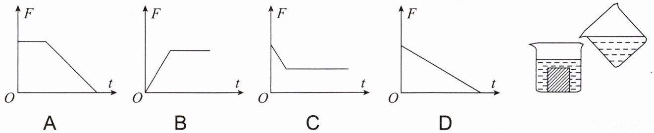 5. 如右下图所示,把铁块放在空容器中,沿容器壁缓慢向容器中加水至实线处。加水过程中,铁块受到浮力。在加水的全过程中,容器底对铁块的支持力$F$与时间$t$的关系图像是下图中的 (