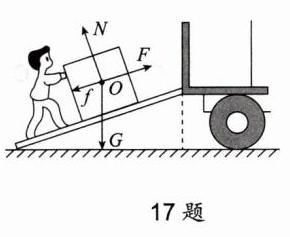 17. 如图所示,小明用一个沿斜面的力将大箱子推进车厢,请画出箱子沿斜面向上运动时的受力示意图(点O为箱子的重心)。