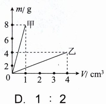 7. 甲、乙两种物体的质量和体积的关系图像如图所示,若用质量相等的甲、乙两种物质分别制成等高的实心圆柱体A、B,把它们并排竖直放在水平地面上,则两圆柱体A、B对水平地面的压强之比是(