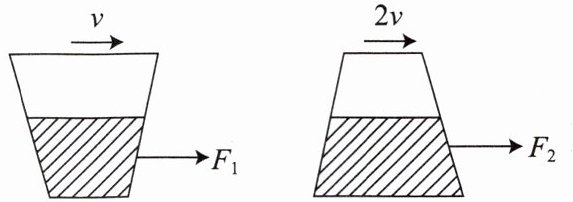 7. 两个用同一种材料制成且完全相同的密闭圆台形容器一正一反放置在同一水平桌面上,容器内装有质量和深度均相同的不同液体,如图所示。若它们分别在水平方向拉力 $ F_{1} $ 和 $ F_{2} $ 的作用下沿水平桌面做匀速直线运动,速度分别为 $ v $ 和 $ 2v $,容器底部受到液体的压强分别为 $ p_{1} $ 和 $ p_{2} $。下列关系正确的是 (