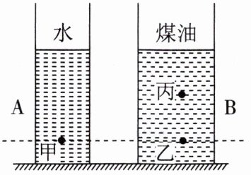 5. 如图所示,水平地面上 $ A $、$ B $ 两圆柱形容器中的液面相平,甲、乙、丙三处液体的压强分别为 $ p_{甲} $、$ p_{乙} $ 和 $ p_{丙} $($ \rho_{水} > \rho_{煤油} $),则 $ p_{甲} $、$ p_{乙} $ 和 $ p_{丙} $ 的大小关系为 (