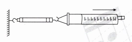 。(2) 如图所示,水平向右慢慢拉动注射器筒,当注射器的活塞开始滑动时,记下弹簧测力计的示数 $ F $,用刻度尺测出注射器的全部刻度的长 $ L $,则大气压的值可表示为 $ p = $