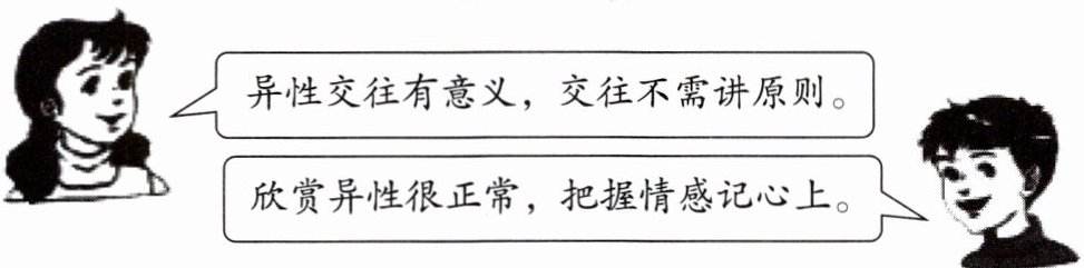 男生、女生的观点都不正确。①与异性交往对我们的成长有积极作用。与异性交往,可以增进对异性的了解,消除神秘感;可以扩大交往范围,提高交往能力。与异性友好坦然地合作,有助于完善自身,让我们在团结和睦的集体中共同成长。②与异性交往要把握好尺度。我们应注意交往的方式、场合、时间和频率,既要热情大方,又要掌握分寸,做到言谈得当、举止得体。我们要学会恰当地与异性交往,让这份友谊成为美好青春的见证。③在与异性交往中,我们可能会萌发对异性的朦胧情感,会因为对异性的欣赏、对未来的向往而感到愉悦,也容易把这种欣赏和向往当作爱情。真正的爱情,不仅意味着热烈的情感、彼此的欣赏和尊重,而且需要责任、能力和担当。面对生活中可能出现的朦胧情感,我们应该慎重对待,理智处理。