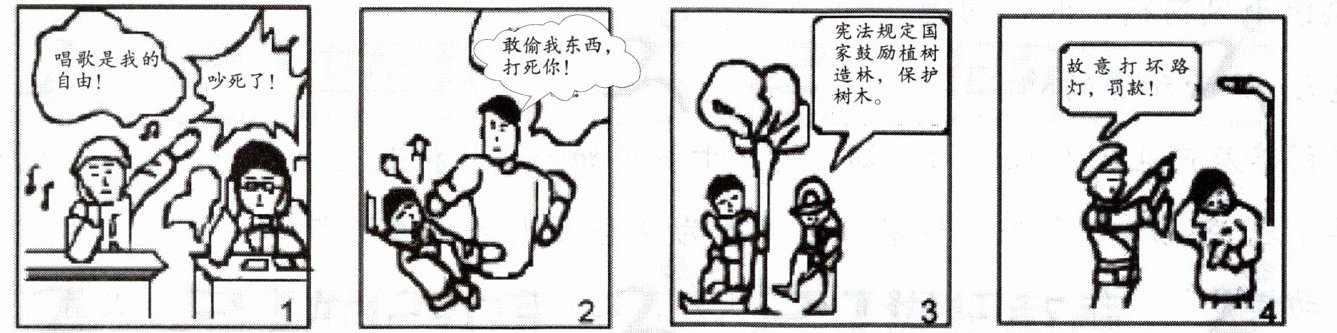 (1)漫画 1:不得损害国家的、社会的、集体的利益和其他公民的合法自由和权利。漫画 2:应以合法方式行使权利。