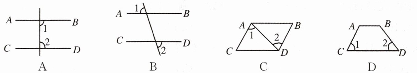2. 下列图形中,由$AB// CD$,能得到$∠1=∠2$的是 (