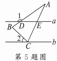 5. 如图,在$△ABC$中,$AB= AC$,$∠A= 30^{\circ }$,直线$a// b$,顶点$C在直线b$上,直线$a交AB于点D$,交$AC于点E$。若$∠1= 145^{\circ }$,则$∠2$的度数为()