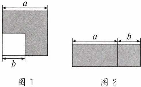 17. 如图,图 1 为边长为 a 的大正方形中有一个边长为 b 的小正方形,图 2 是由图 1 中阴影部分拼成的一个长方形。