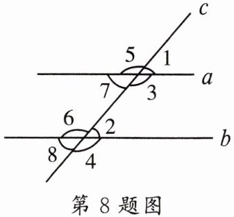 8. 如图,直线a,b都与直线c相交,下列条件:①$∠1= ∠2$;②$∠3= ∠6$;③$∠5+∠7= 180^{\circ }$;④$∠5+∠8= 180^{\circ }$。能判定$a// b$的条件有 ()
