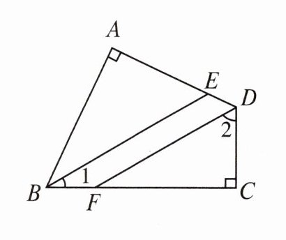 由于$BE$,$DF$分别是$\angle ABC$,$\angle ADC$的平分线,所以$\angle 1=\frac{1}{2}\angle ABC$,$\angle 2 = \frac{1}{2}\angle ADC$。