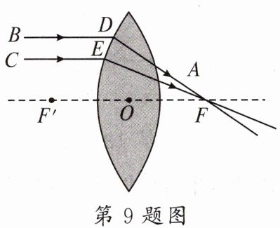 9. 通过实验发现,凸透镜能使与主光轴平行的光线聚在主光轴上一点。如图,箭头所画的是光线的方向,点$F$是凸透镜的焦点,$BD// CE// OF$,若$∠BDF = 150^{\circ}$,$∠CEF = 161^{\circ}$,则$∠DFE$的度数是 ()