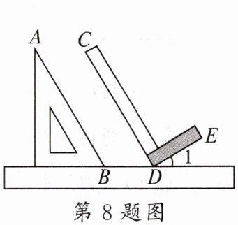 8. 在同一平面内,将直尺、含$30^{\circ}角的三角尺和木工角尺(CD⊥DE)$按如图方式摆放。若$AB// CD$,则$∠1$的大小为 ()