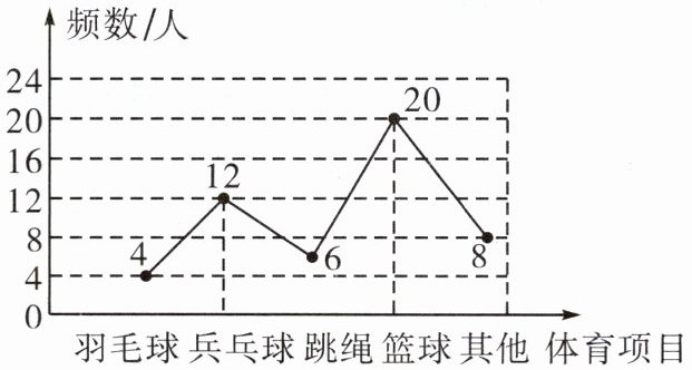 5. 体育老师对七年级(2)班学生“你最喜欢的体育项目是什么?(只写一项)”的问题进行了调查,把所得数据绘制成如图所示的折线统计图。由图可知,最喜欢篮球的学生的频率是 ()