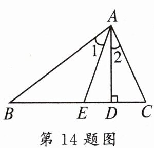 14. 如图,在$△ABC$中,$AD⊥BC$,AE 平分$∠BAC$。若$∠1= 30^{\circ },∠2= 20^{\circ }$,则