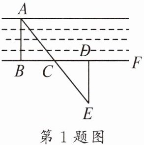 1. 如图,要测量河两岸相对的两点A,B的距离,先过点B作$BF⊥AB$,在BF上找点D,过点D作$DE⊥BF$,再取BD的中点C,连接AC并延长,与DE交点为E,此时测得DE的长度就是AB的长度。这里判定$△ABC和△EDC$全等的依据是()