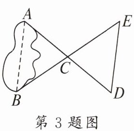 3. 如图,要测池塘两端A,B之间的距离,小明先在地上取一个可以直接到达A和B的点C,连接AC并延长到D,使$CD= CA$。连接BC并延长到E,使$CE= CB$,发现$DE= AB$。那么判定$△ABC和△DEC$全等的依据是()