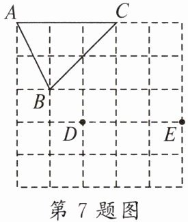 7. 如图是$5×5$的正方形网格,以D,E为顶点作位置不同的格点三角形与$△ABC$全等,这样格点三角形最多可以画出 ()