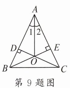 9. 如图,$CD⊥AB,BE⊥AC$,垂足分别为D,E,BE,CD相交于点O,$∠1= ∠2$,连接BC。则图中全等的三角形共有 ()