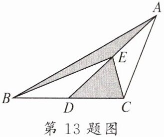 13. 如图,AD是$△ABC$的中线,E是AD的中点,连接BE,CE。若$△ABC$的面积为16,则阴影部分的面积为____。