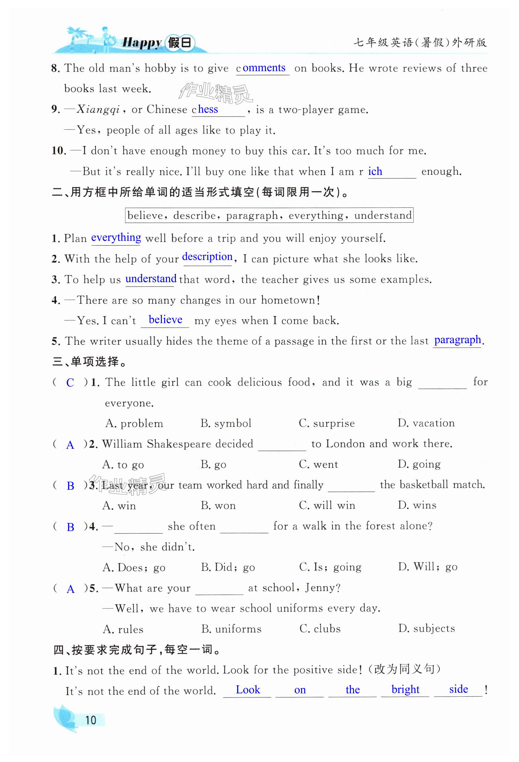 注:目前有些书本章节名称可能整理的还不是很完善,但都是按照顺序排列的,请同学们按照顺序仔细查找。练习册 2025年暑假Happy假日七年级英语全一册外研版 答案主要是用来给同学们做完题方便对答案用的,请勿直接抄袭。