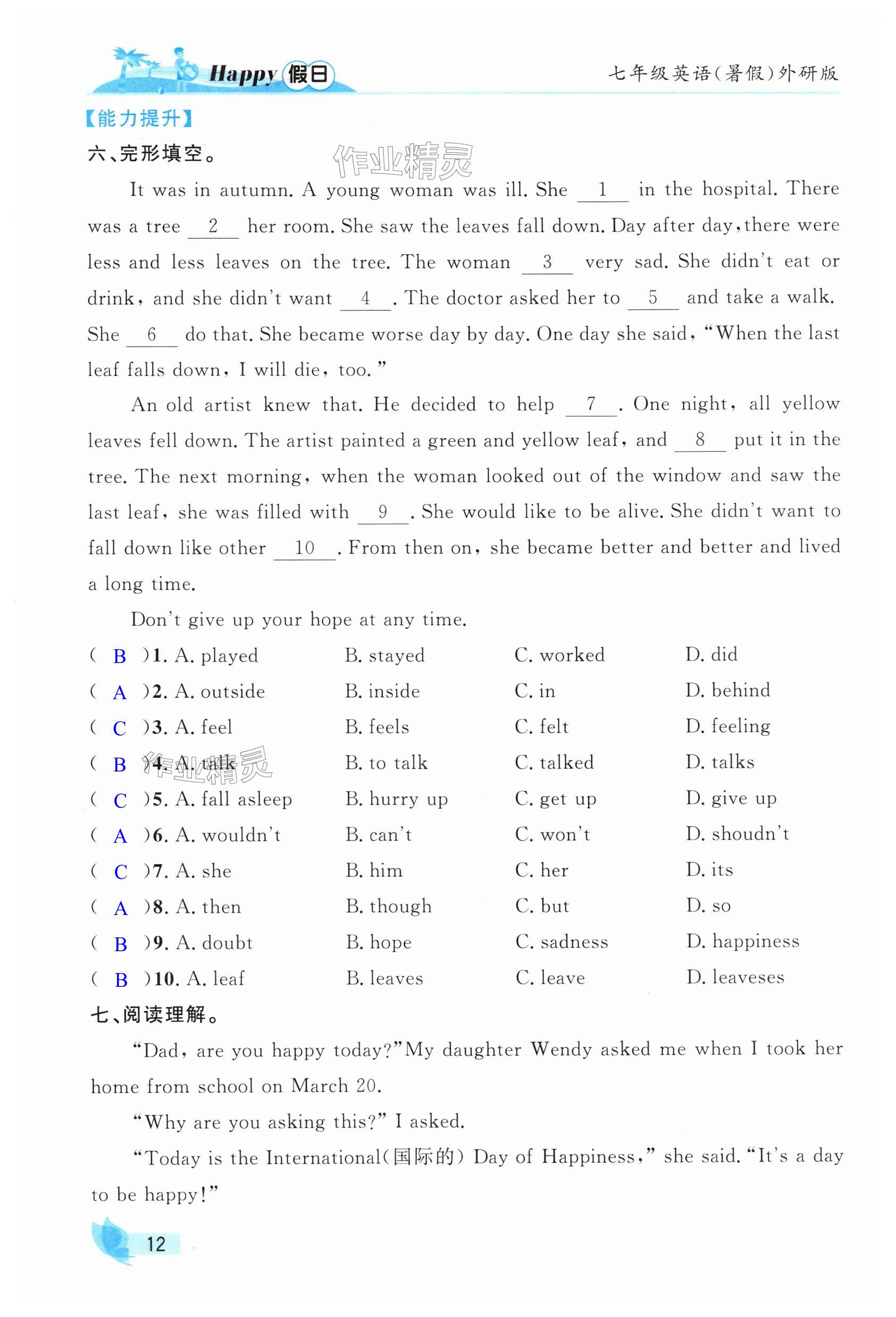 注:目前有些书本章节名称可能整理的还不是很完善,但都是按照顺序排列的,请同学们按照顺序仔细查找。练习册 2025年暑假Happy假日七年级英语全一册外研版 答案主要是用来给同学们做完题方便对答案用的,请勿直接抄袭。