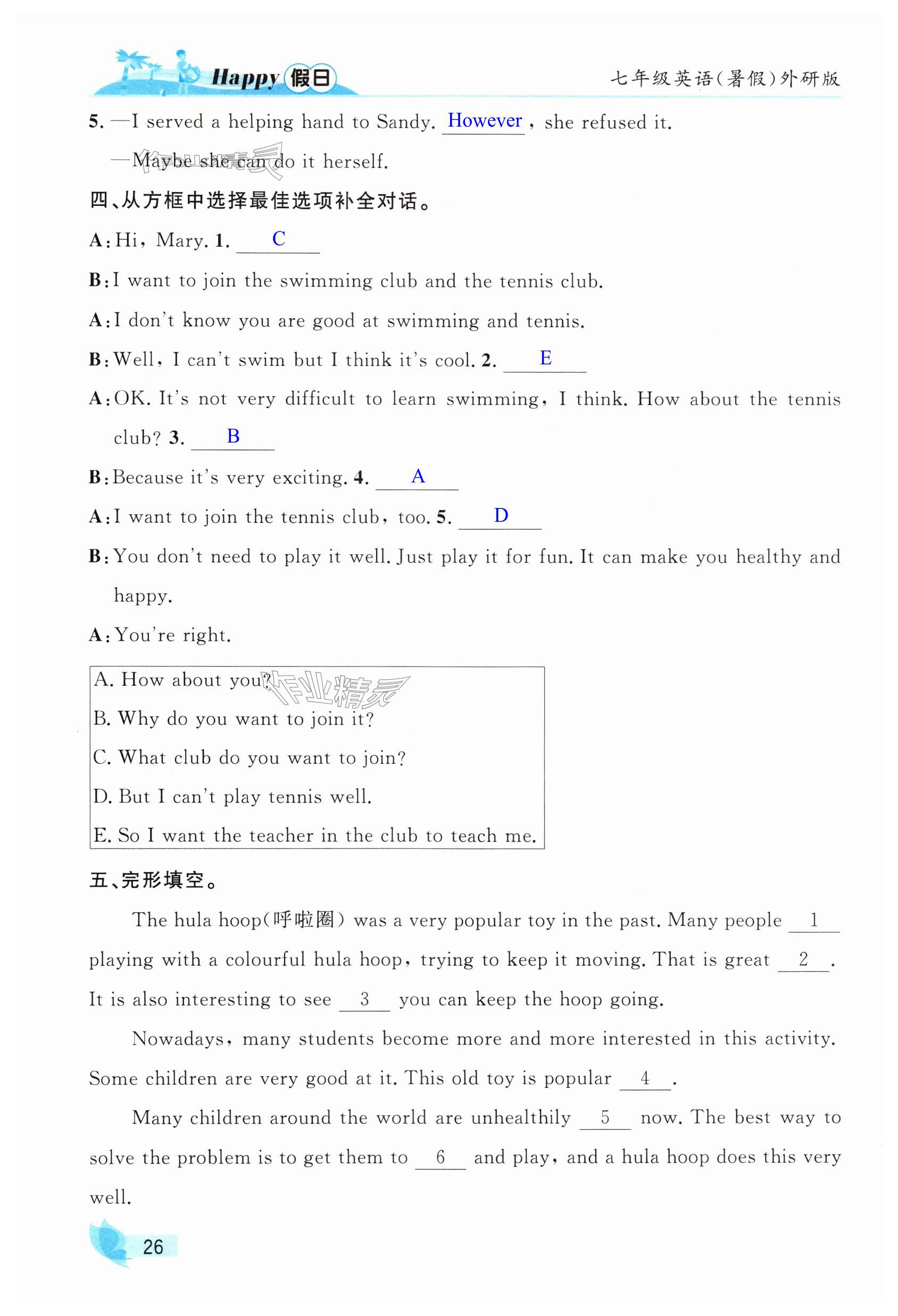 注:目前有些书本章节名称可能整理的还不是很完善,但都是按照顺序排列的,请同学们按照顺序仔细查找。练习册 2025年暑假Happy假日七年级英语全一册外研版 答案主要是用来给同学们做完题方便对答案用的,请勿直接抄袭。