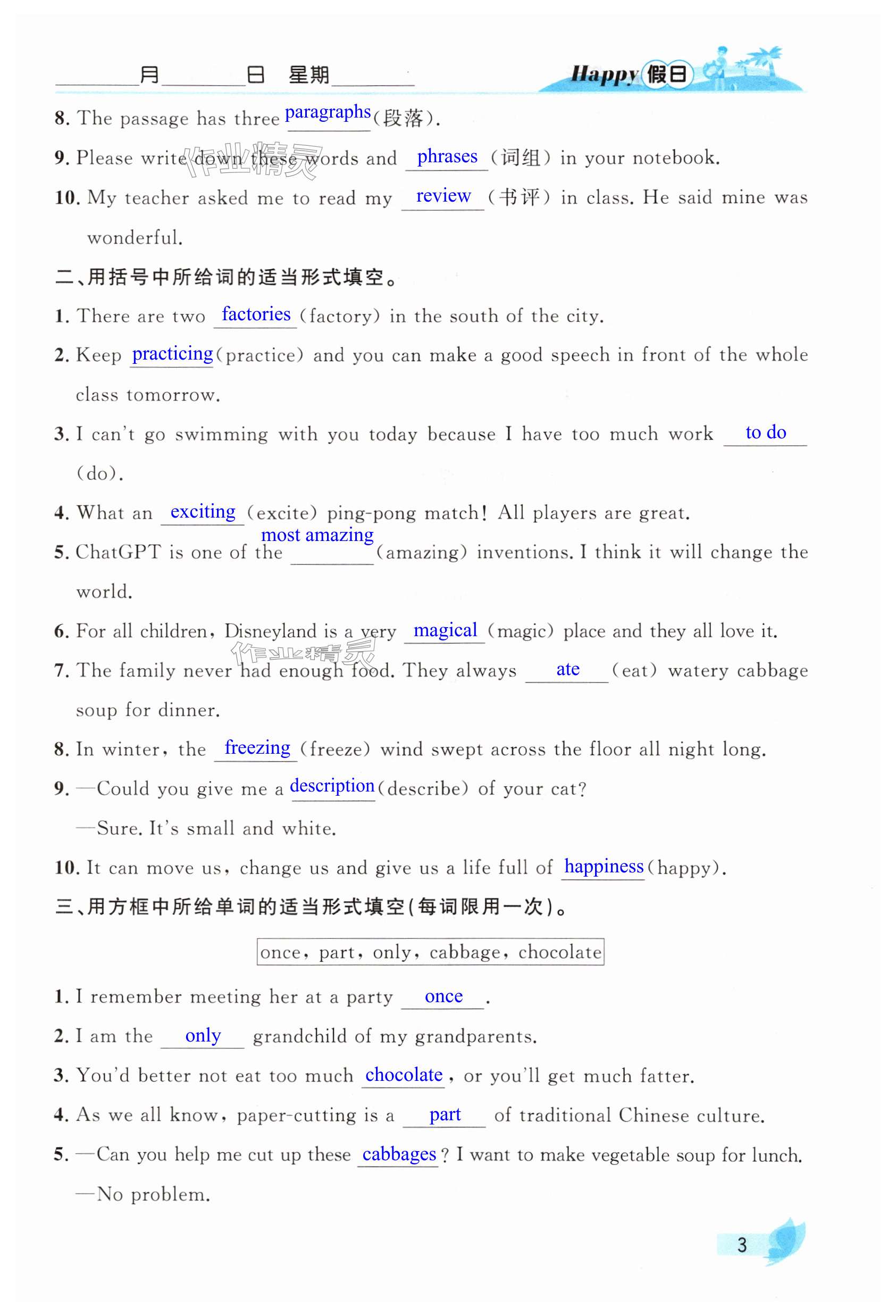注:目前有些书本章节名称可能整理的还不是很完善,但都是按照顺序排列的,请同学们按照顺序仔细查找。练习册 2025年暑假Happy假日七年级英语全一册外研版 答案主要是用来给同学们做完题方便对答案用的,请勿直接抄袭。