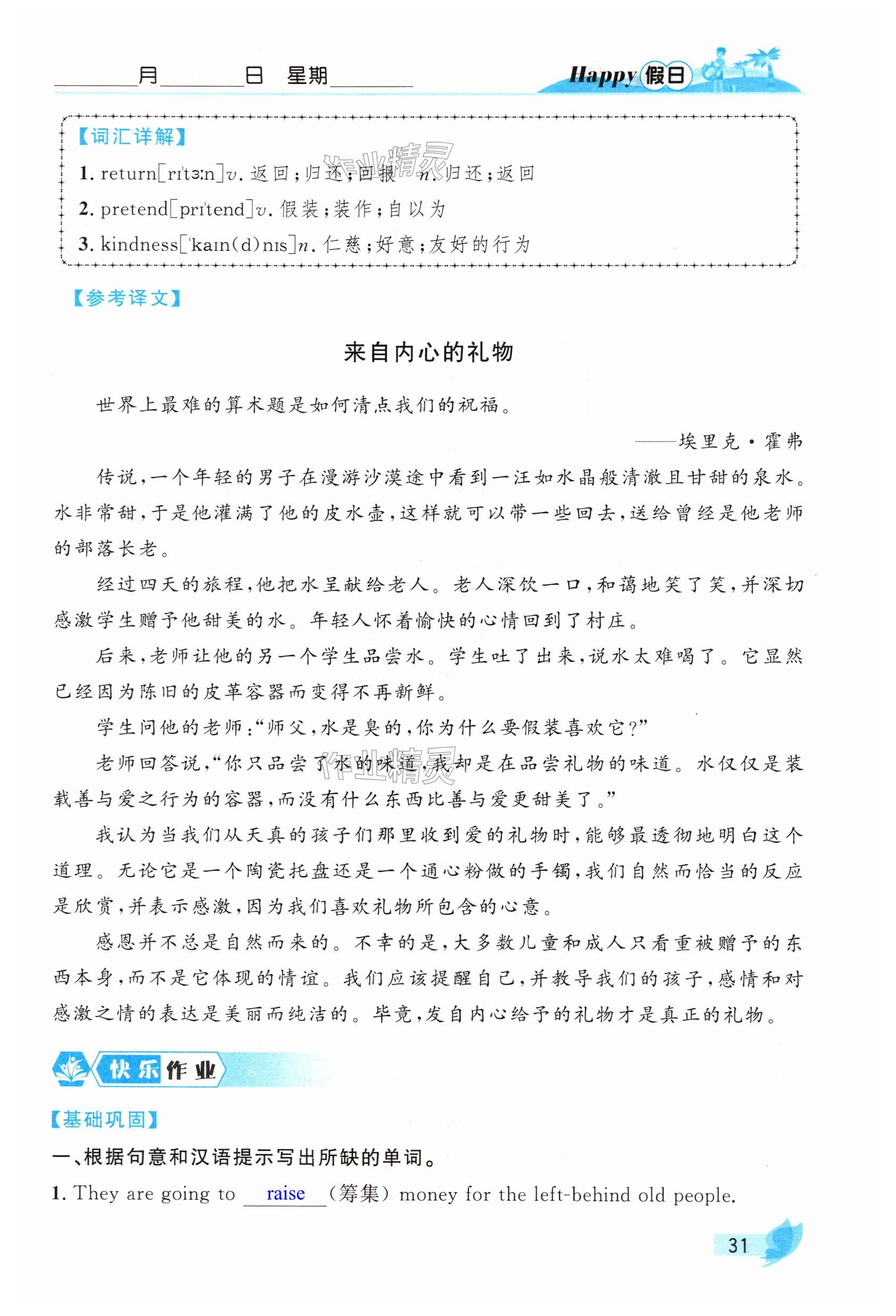 注:目前有些书本章节名称可能整理的还不是很完善,但都是按照顺序排列的,请同学们按照顺序仔细查找。练习册 2025年暑假Happy假日七年级英语全一册外研版 答案主要是用来给同学们做完题方便对答案用的,请勿直接抄袭。