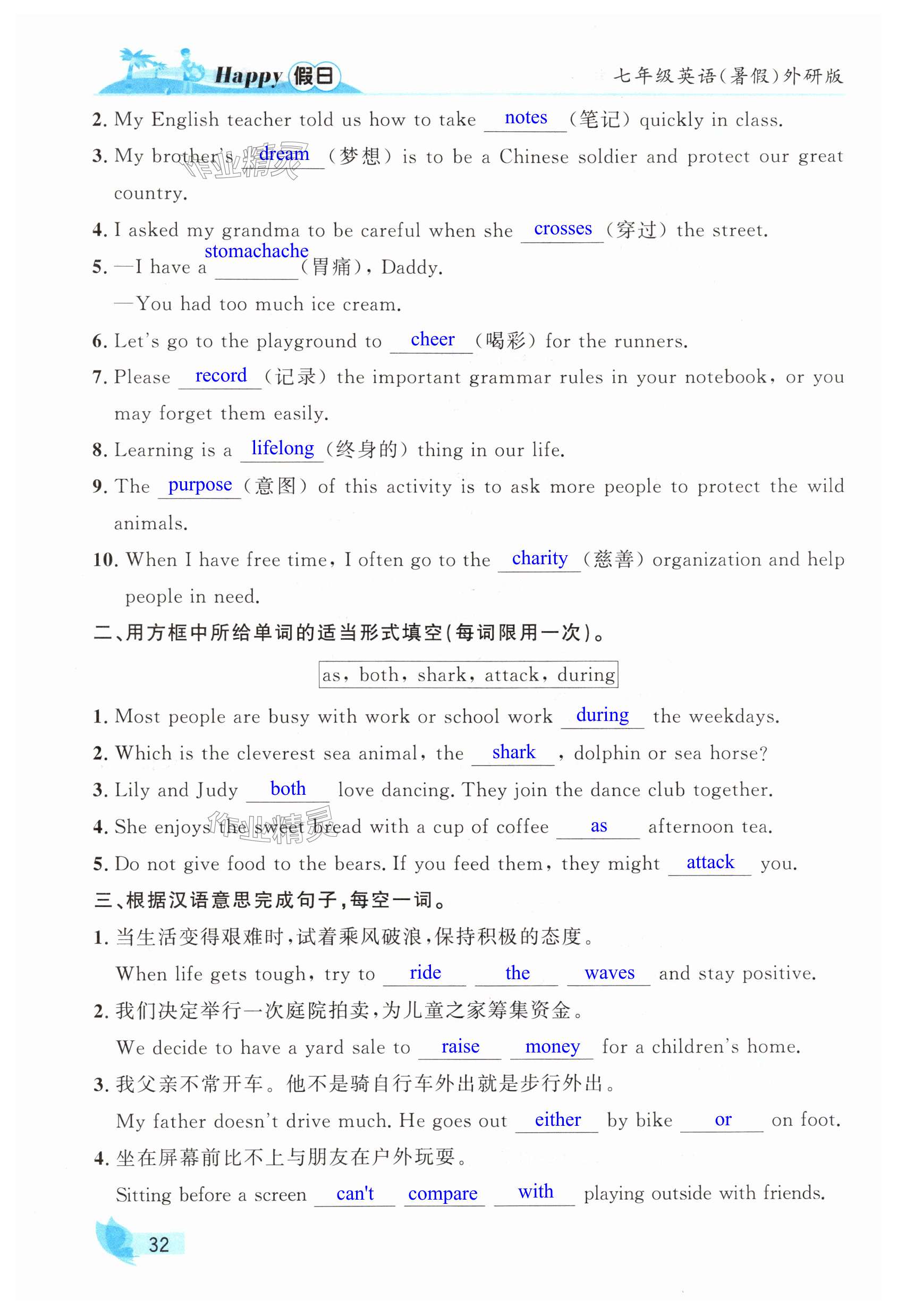 注:目前有些书本章节名称可能整理的还不是很完善,但都是按照顺序排列的,请同学们按照顺序仔细查找。练习册 2025年暑假Happy假日七年级英语全一册外研版 答案主要是用来给同学们做完题方便对答案用的,请勿直接抄袭。