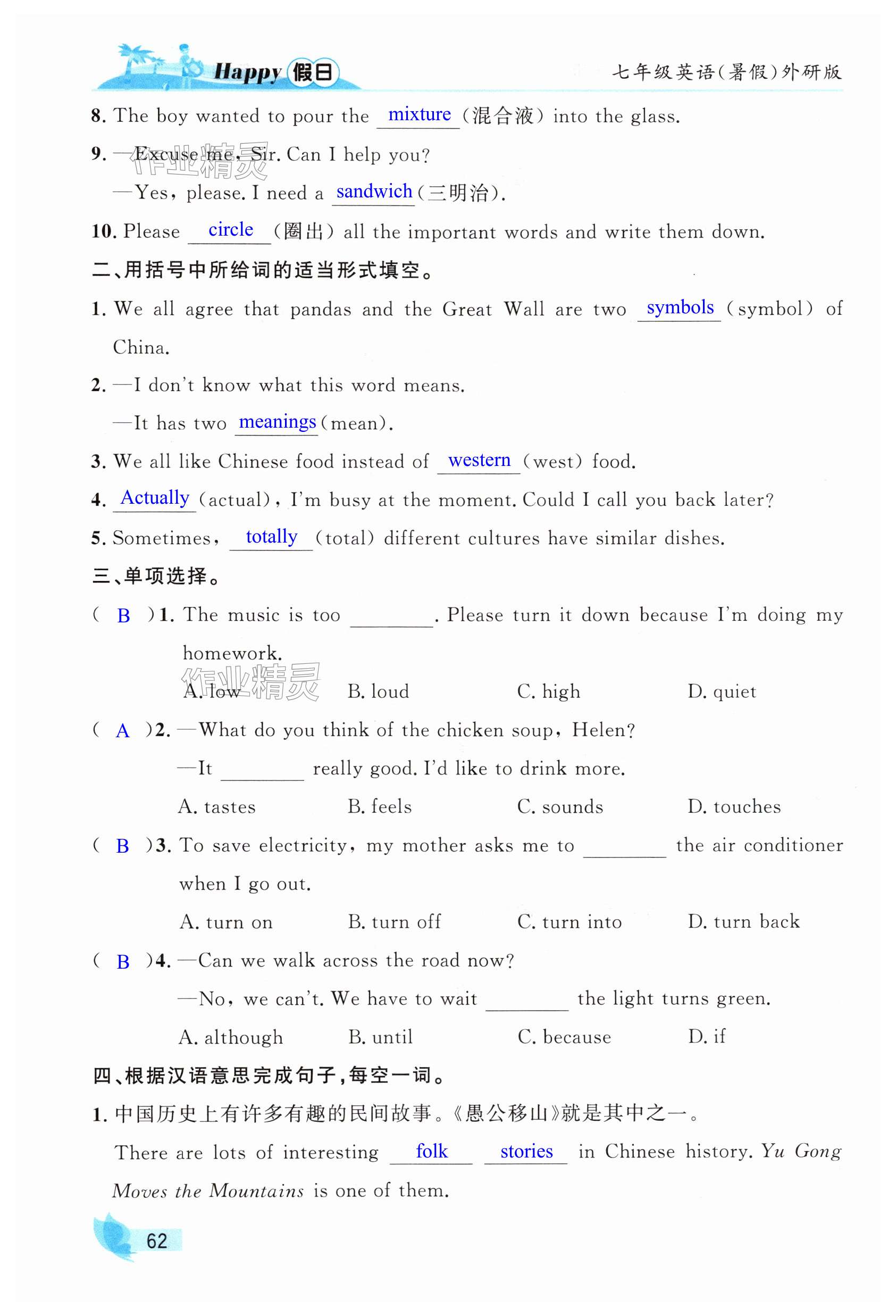 注:目前有些书本章节名称可能整理的还不是很完善,但都是按照顺序排列的,请同学们按照顺序仔细查找。练习册 2025年暑假Happy假日七年级英语全一册外研版 答案主要是用来给同学们做完题方便对答案用的,请勿直接抄袭。