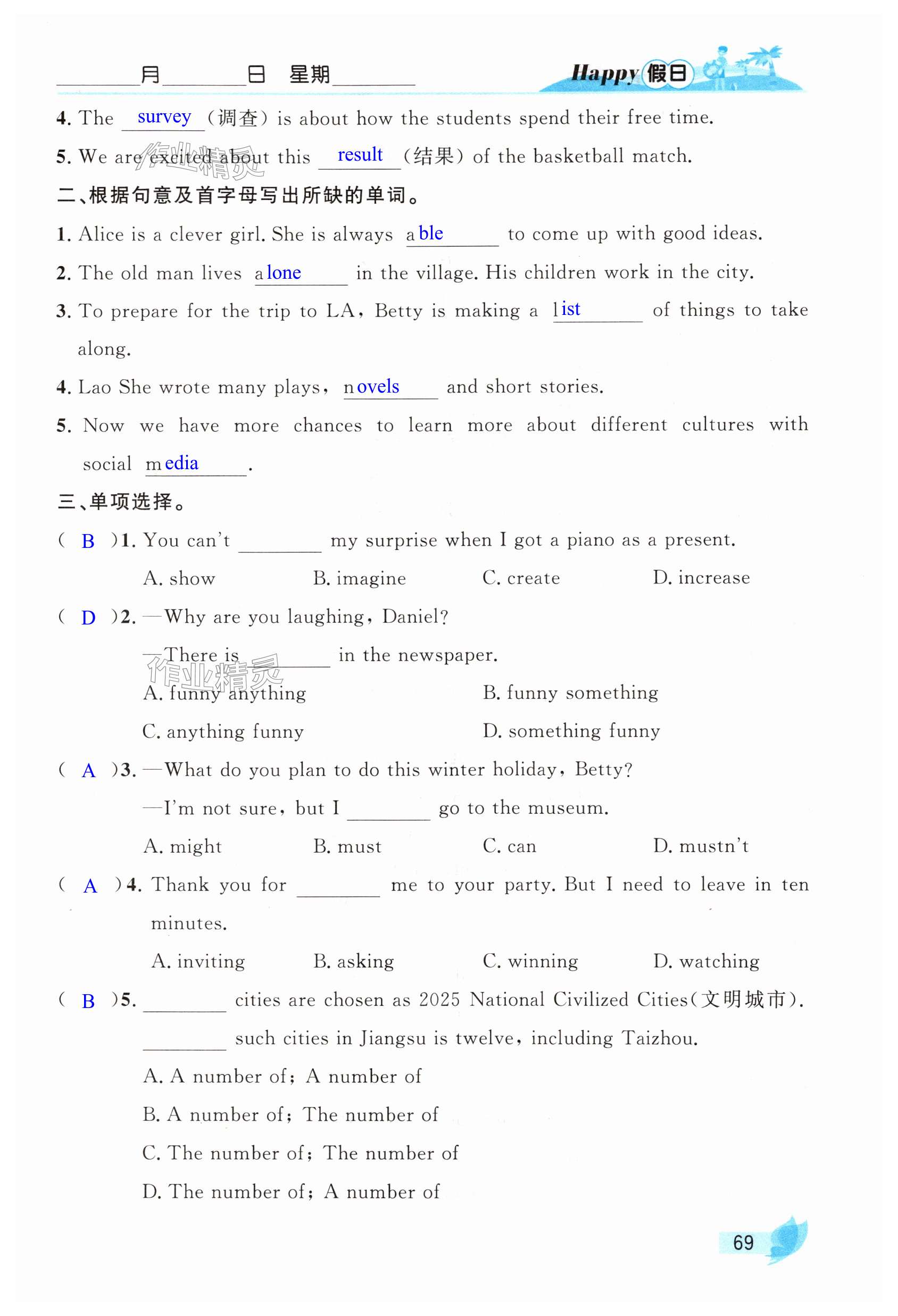 注:目前有些书本章节名称可能整理的还不是很完善,但都是按照顺序排列的,请同学们按照顺序仔细查找。练习册 2025年暑假Happy假日七年级英语全一册外研版 答案主要是用来给同学们做完题方便对答案用的,请勿直接抄袭。