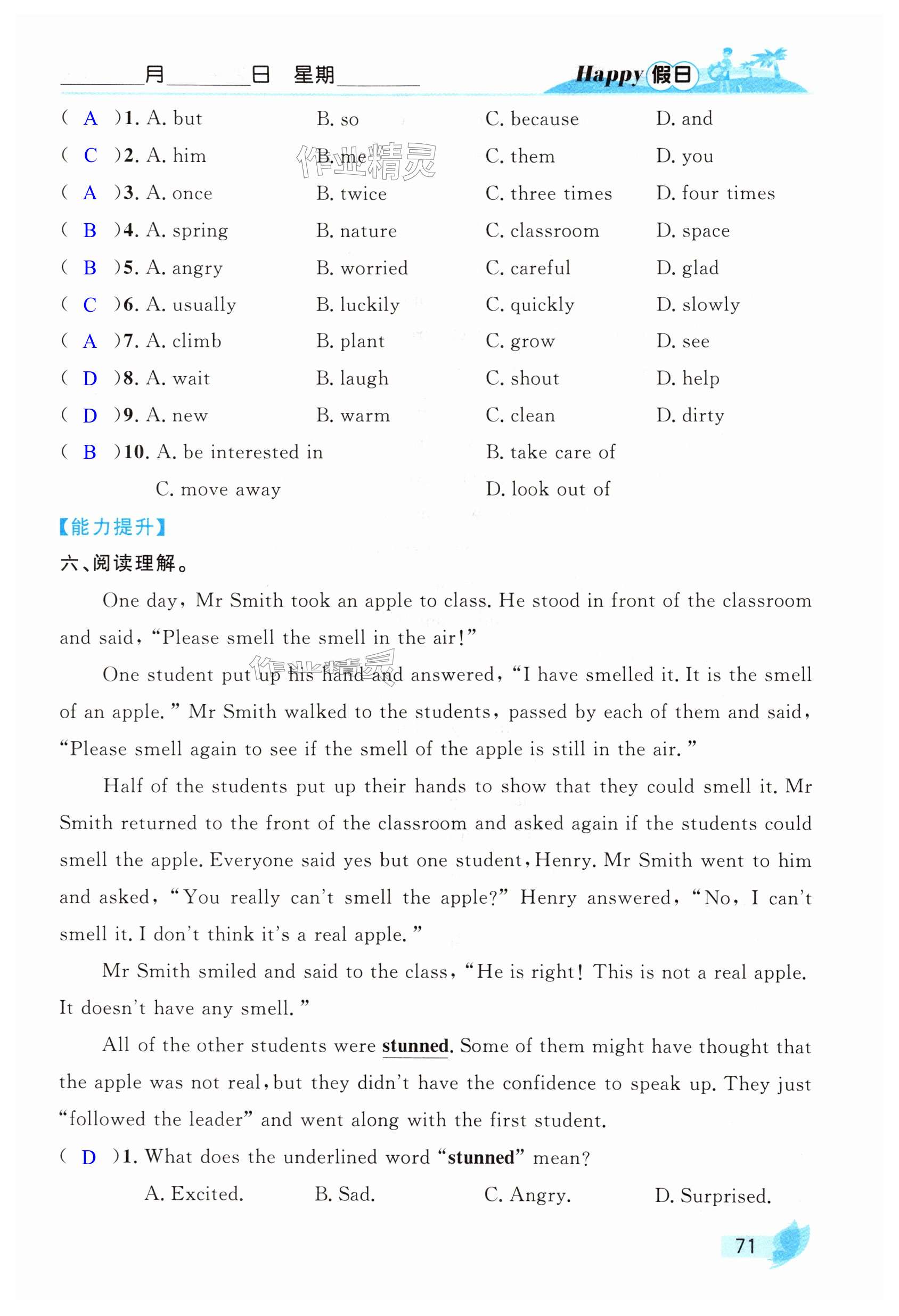 注:目前有些书本章节名称可能整理的还不是很完善,但都是按照顺序排列的,请同学们按照顺序仔细查找。练习册 2025年暑假Happy假日七年级英语全一册外研版 答案主要是用来给同学们做完题方便对答案用的,请勿直接抄袭。