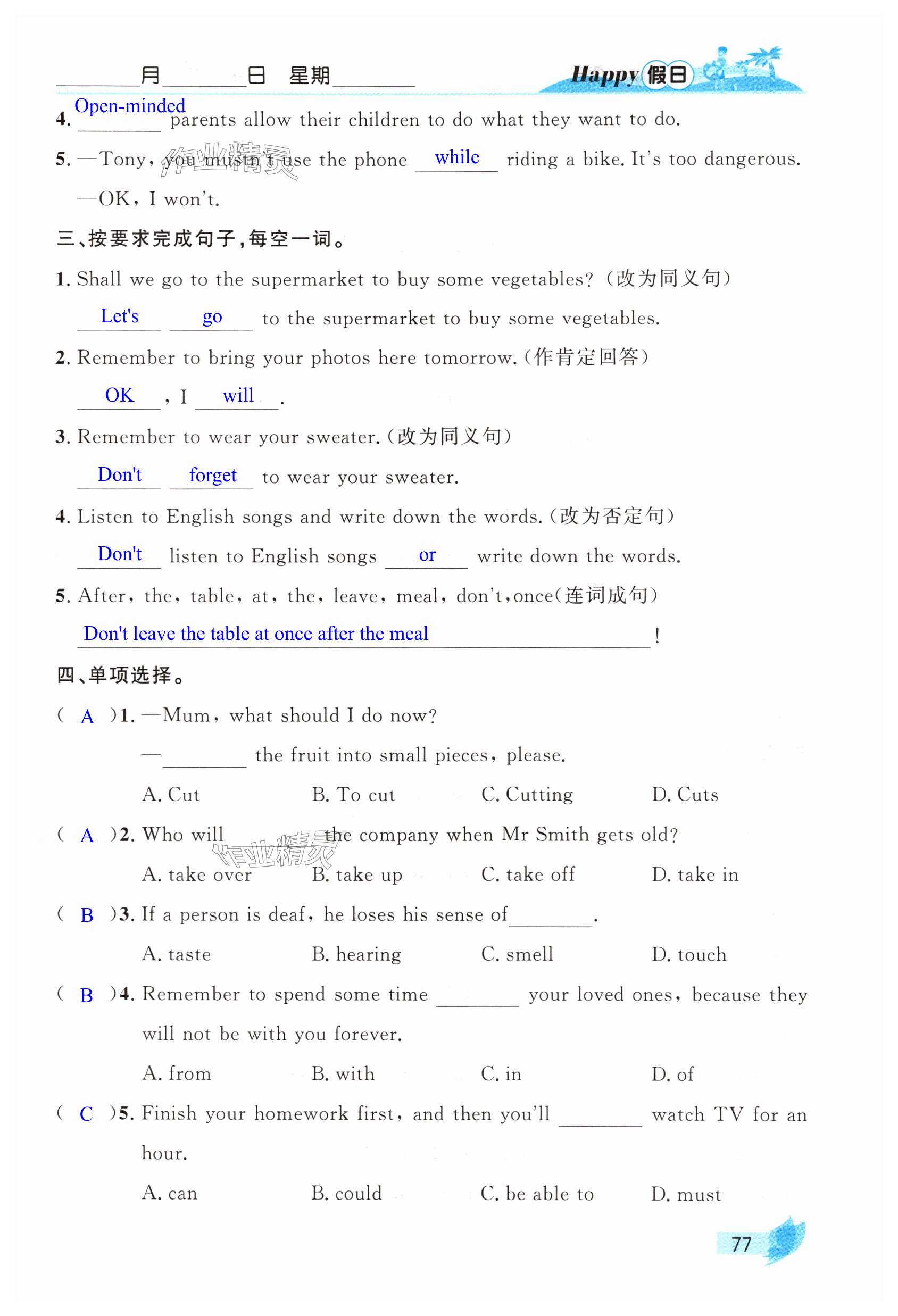 注:目前有些书本章节名称可能整理的还不是很完善,但都是按照顺序排列的,请同学们按照顺序仔细查找。练习册 2025年暑假Happy假日七年级英语全一册外研版 答案主要是用来给同学们做完题方便对答案用的,请勿直接抄袭。