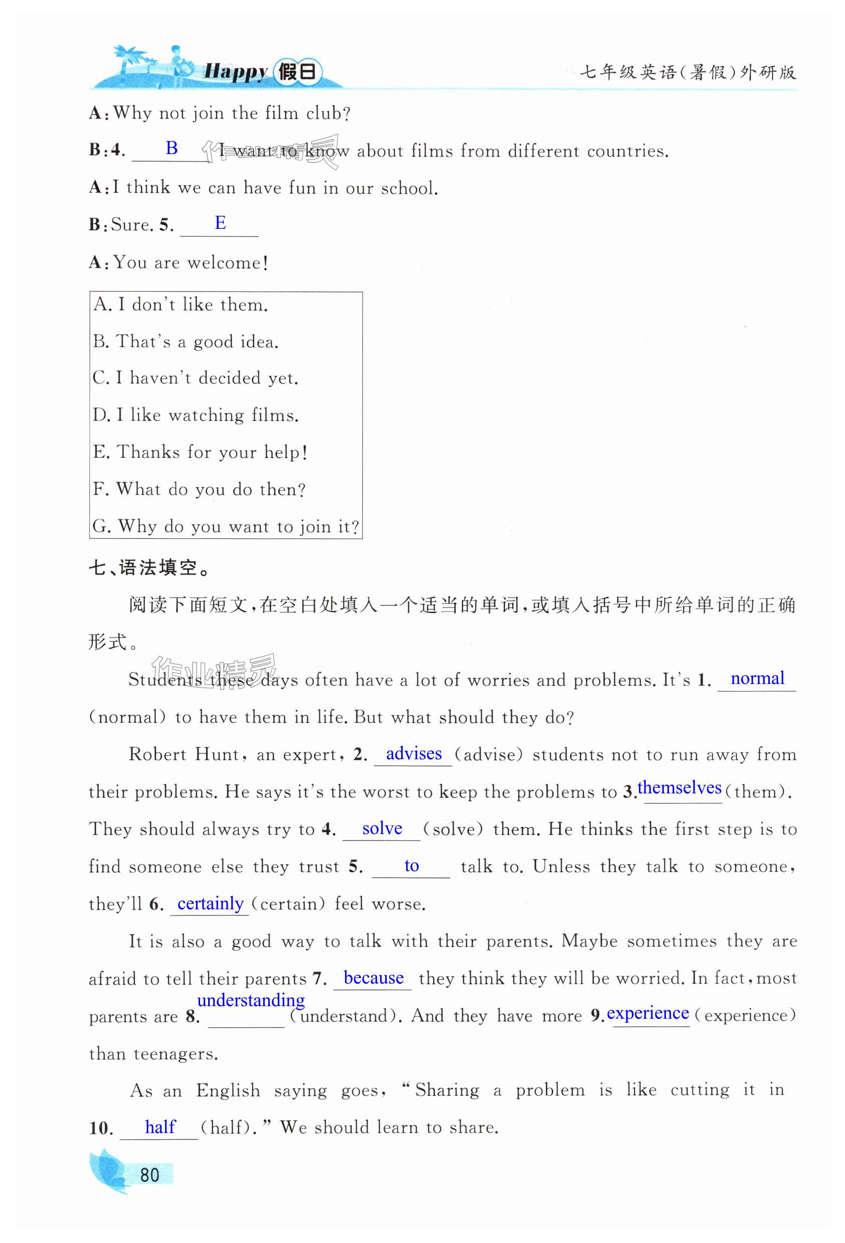 注:目前有些书本章节名称可能整理的还不是很完善,但都是按照顺序排列的,请同学们按照顺序仔细查找。练习册 2025年暑假Happy假日七年级英语全一册外研版 答案主要是用来给同学们做完题方便对答案用的,请勿直接抄袭。