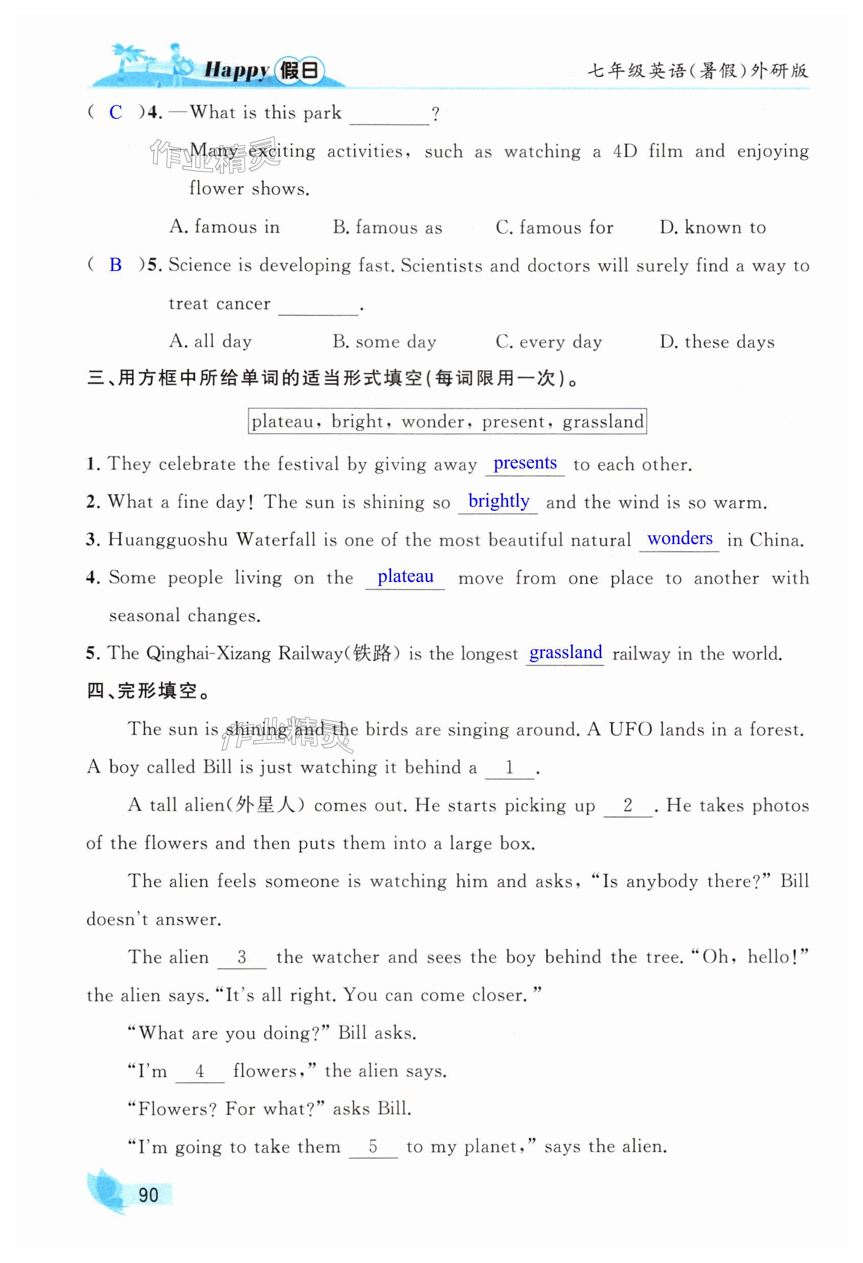 注:目前有些书本章节名称可能整理的还不是很完善,但都是按照顺序排列的,请同学们按照顺序仔细查找。练习册 2025年暑假Happy假日七年级英语全一册外研版 答案主要是用来给同学们做完题方便对答案用的,请勿直接抄袭。