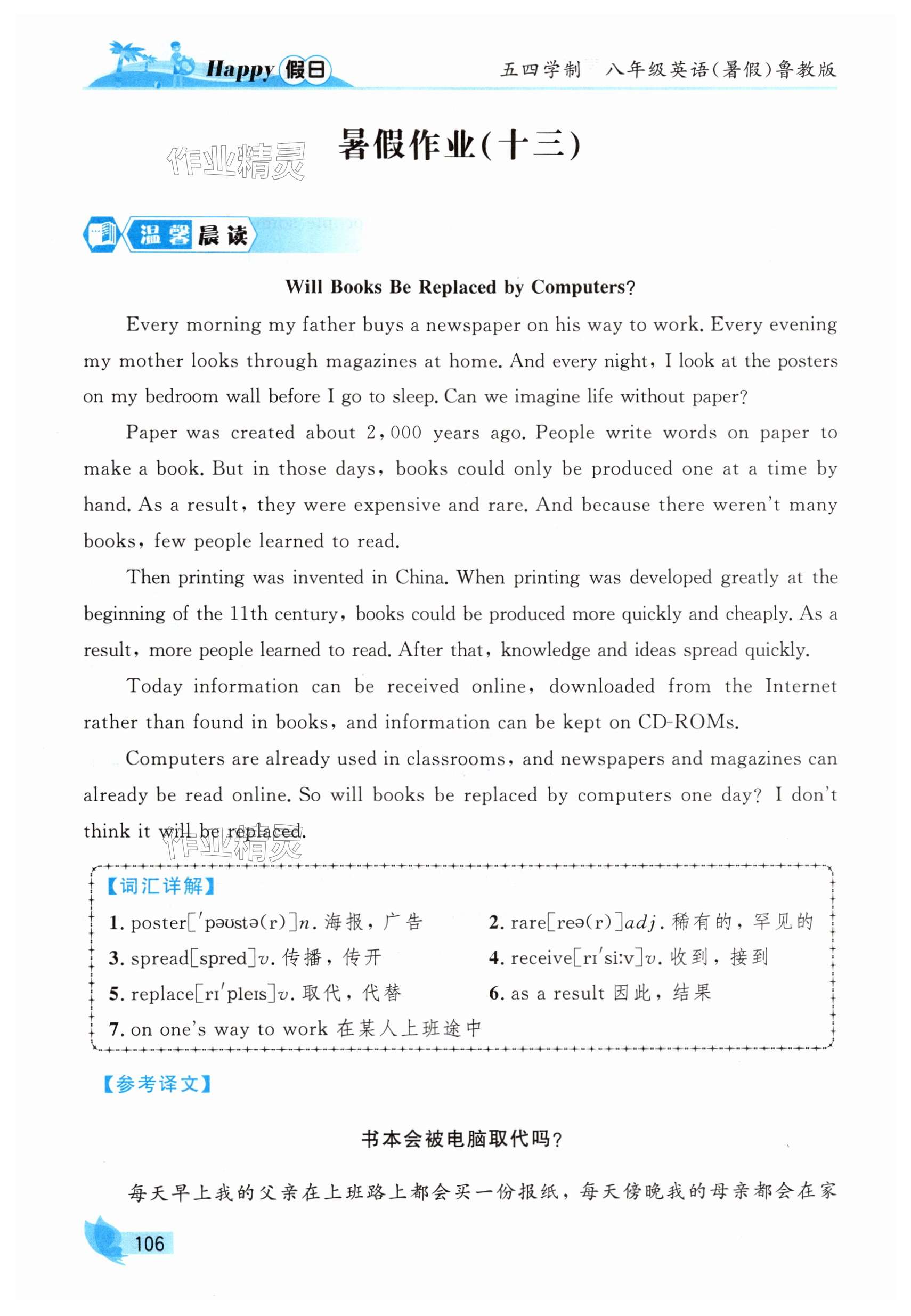 注:目前有些书本章节名称可能整理的还不是很完善,但都是按照顺序排列的,请同学们按照顺序仔细查找。练习册 2025年暑假Happy假日八年级英语鲁教版五四制 答案主要是用来给同学们做完题方便对答案用的,请勿直接抄袭。