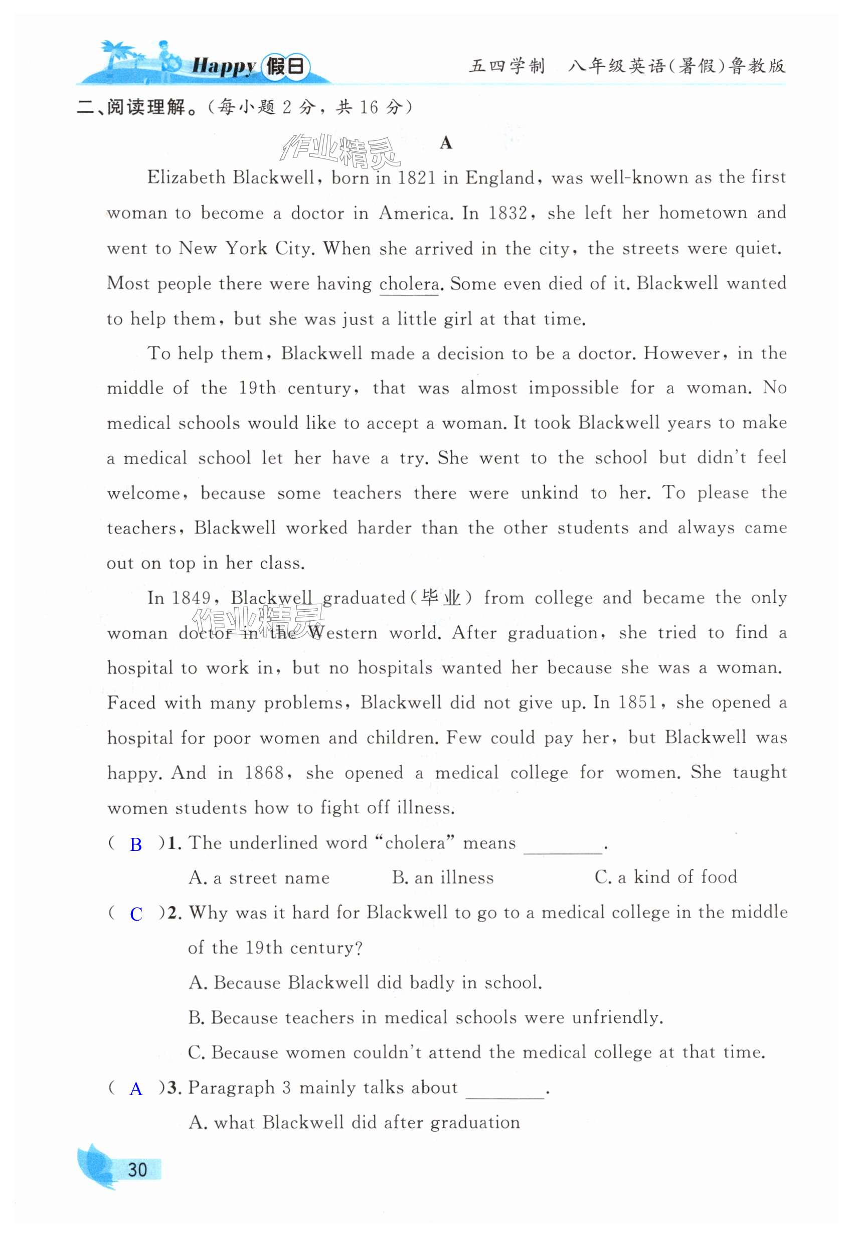 注:目前有些书本章节名称可能整理的还不是很完善,但都是按照顺序排列的,请同学们按照顺序仔细查找。练习册 2025年暑假Happy假日八年级英语鲁教版五四制 答案主要是用来给同学们做完题方便对答案用的,请勿直接抄袭。