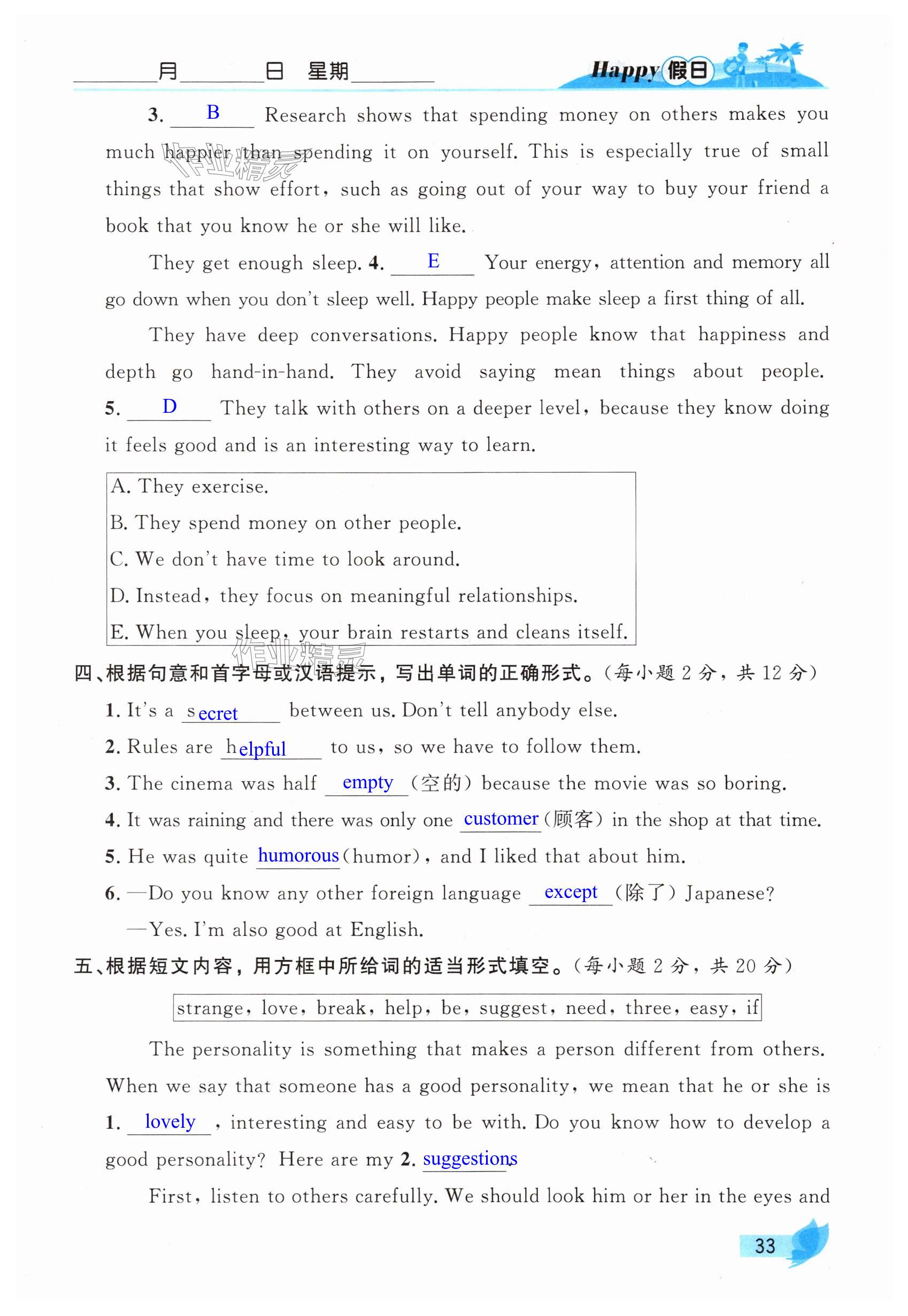 注:目前有些书本章节名称可能整理的还不是很完善,但都是按照顺序排列的,请同学们按照顺序仔细查找。练习册 2025年暑假Happy假日八年级英语鲁教版五四制 答案主要是用来给同学们做完题方便对答案用的,请勿直接抄袭。