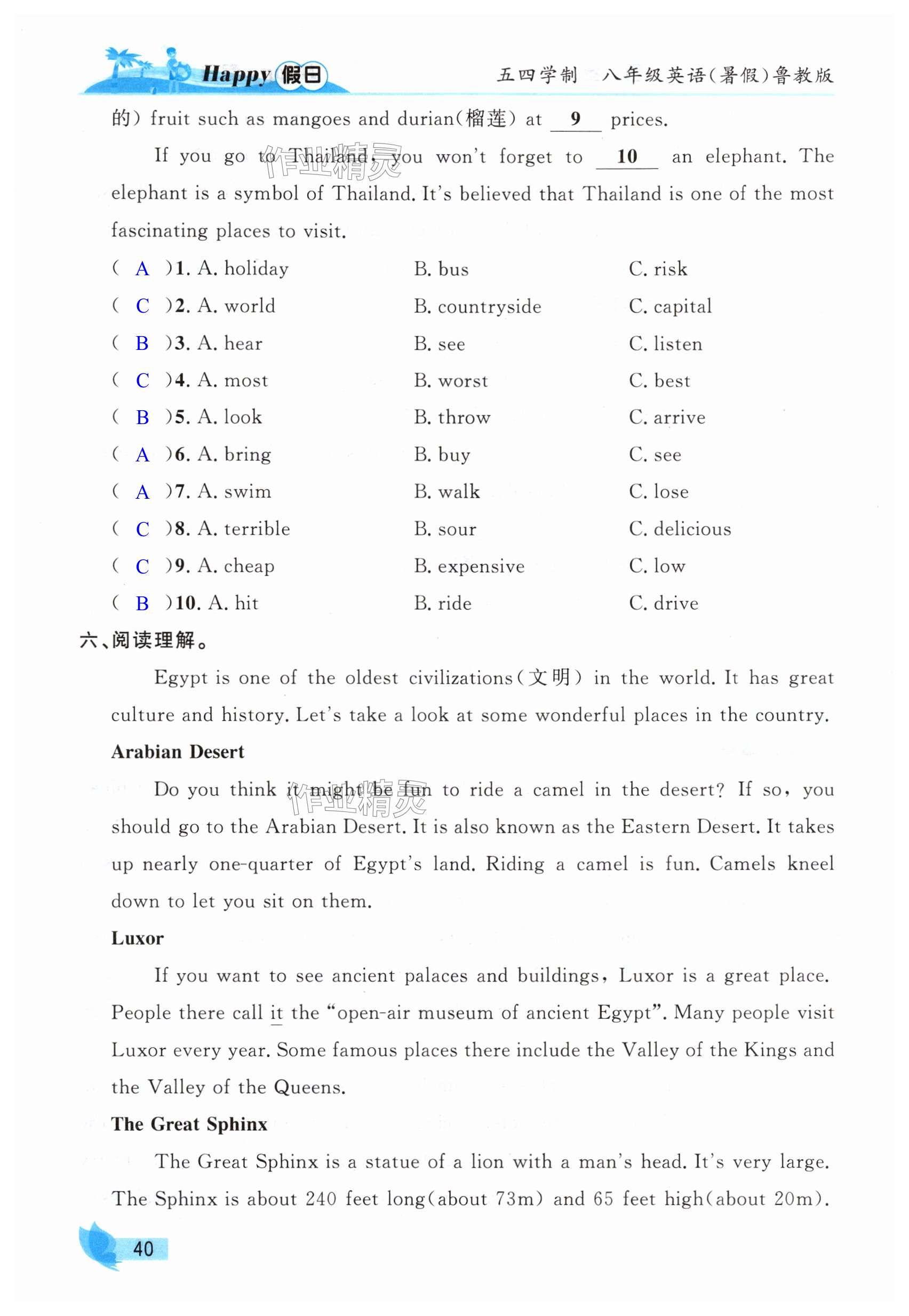 注:目前有些书本章节名称可能整理的还不是很完善,但都是按照顺序排列的,请同学们按照顺序仔细查找。练习册 2025年暑假Happy假日八年级英语鲁教版五四制 答案主要是用来给同学们做完题方便对答案用的,请勿直接抄袭。