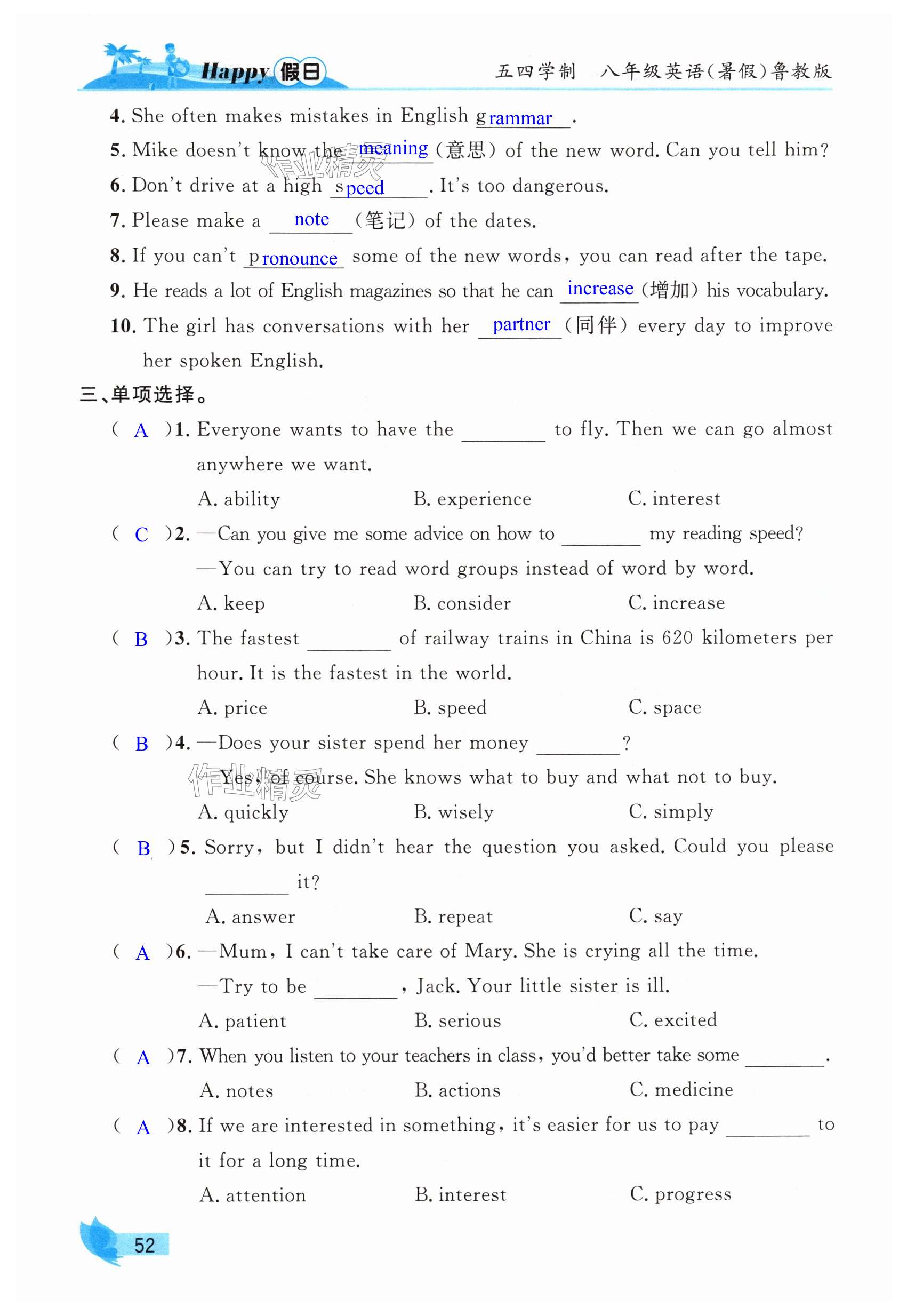 注:目前有些书本章节名称可能整理的还不是很完善,但都是按照顺序排列的,请同学们按照顺序仔细查找。练习册 2025年暑假Happy假日八年级英语鲁教版五四制 答案主要是用来给同学们做完题方便对答案用的,请勿直接抄袭。