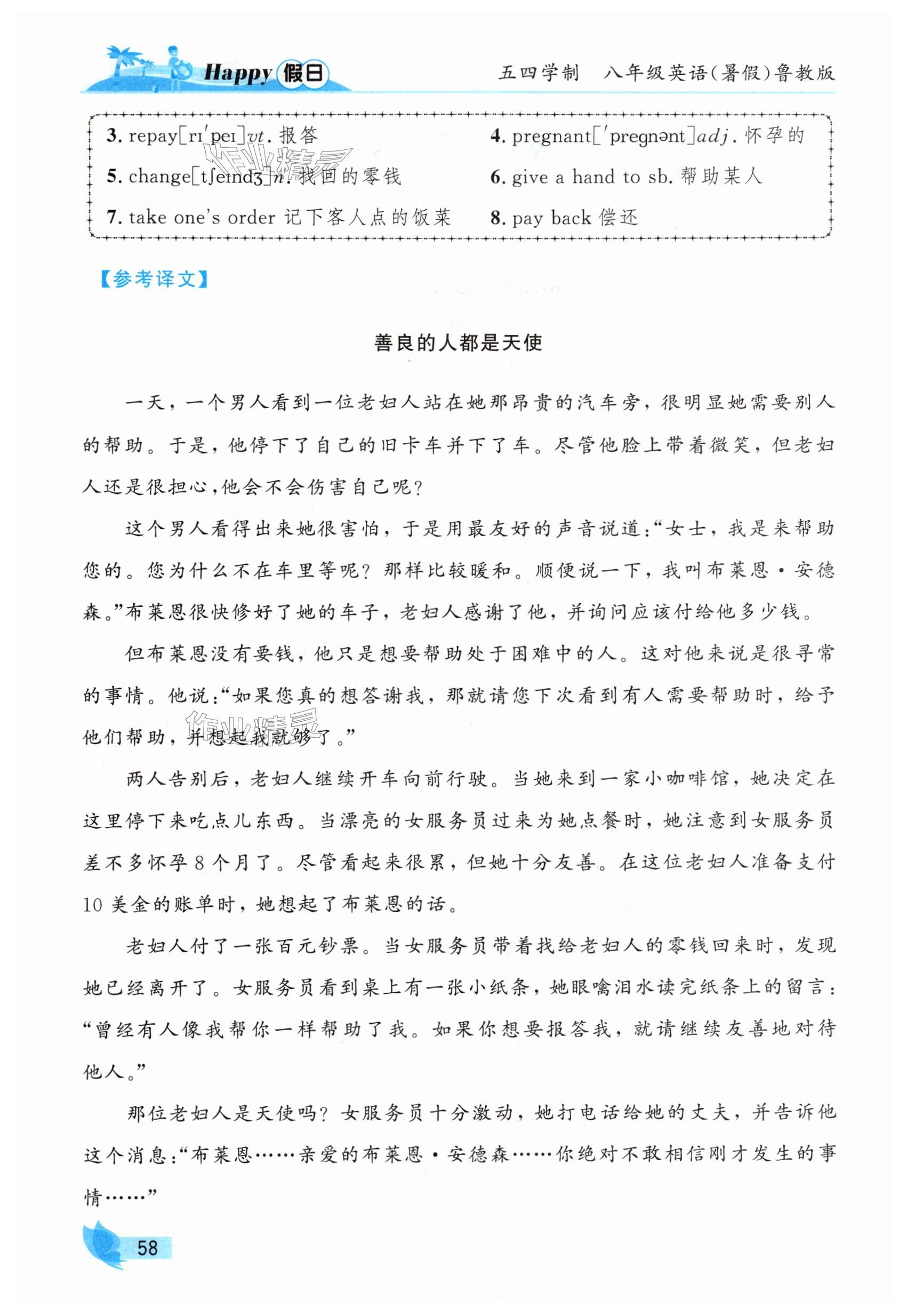 注:目前有些书本章节名称可能整理的还不是很完善,但都是按照顺序排列的,请同学们按照顺序仔细查找。练习册 2025年暑假Happy假日八年级英语鲁教版五四制 答案主要是用来给同学们做完题方便对答案用的,请勿直接抄袭。