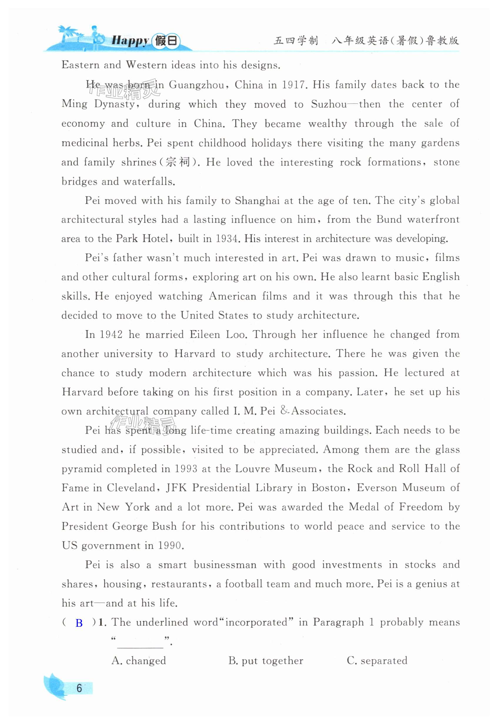 注:目前有些书本章节名称可能整理的还不是很完善,但都是按照顺序排列的,请同学们按照顺序仔细查找。练习册 2025年暑假Happy假日八年级英语鲁教版五四制 答案主要是用来给同学们做完题方便对答案用的,请勿直接抄袭。