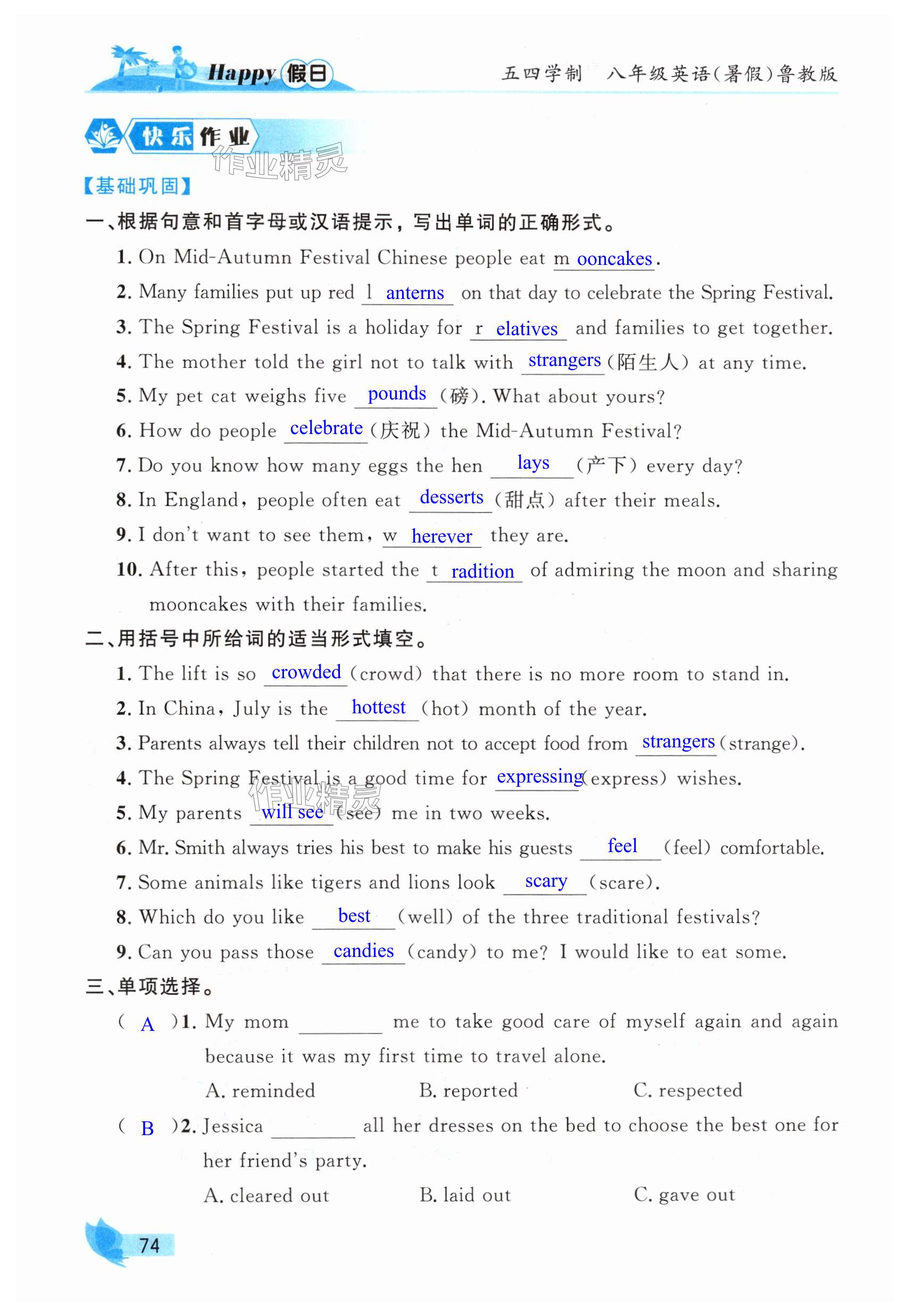注:目前有些书本章节名称可能整理的还不是很完善,但都是按照顺序排列的,请同学们按照顺序仔细查找。练习册 2025年暑假Happy假日八年级英语鲁教版五四制 答案主要是用来给同学们做完题方便对答案用的,请勿直接抄袭。