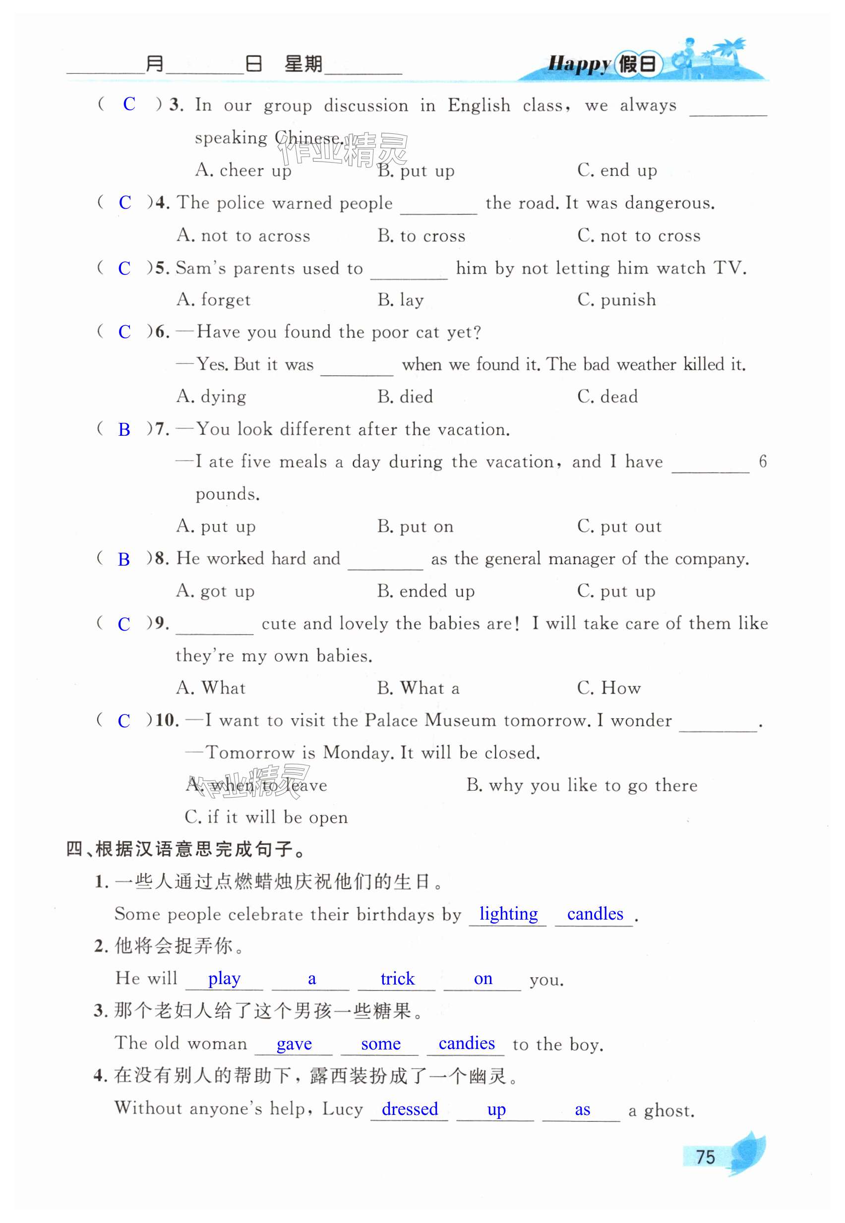 注:目前有些书本章节名称可能整理的还不是很完善,但都是按照顺序排列的,请同学们按照顺序仔细查找。练习册 2025年暑假Happy假日八年级英语鲁教版五四制 答案主要是用来给同学们做完题方便对答案用的,请勿直接抄袭。