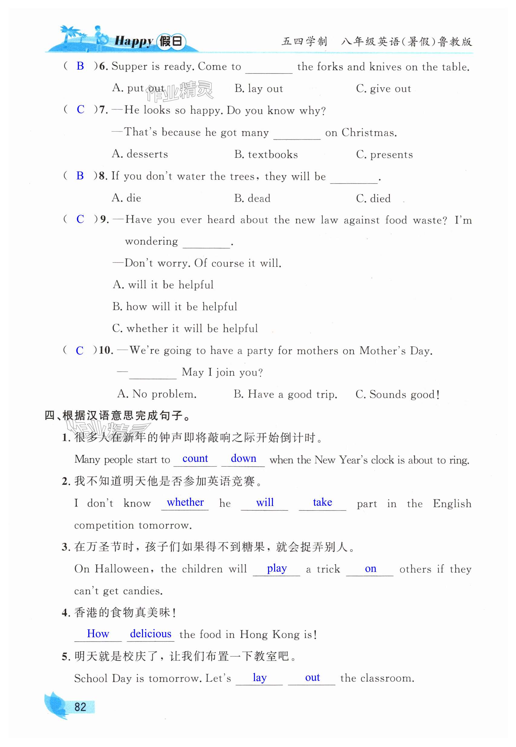 注:目前有些书本章节名称可能整理的还不是很完善,但都是按照顺序排列的,请同学们按照顺序仔细查找。练习册 2025年暑假Happy假日八年级英语鲁教版五四制 答案主要是用来给同学们做完题方便对答案用的,请勿直接抄袭。
