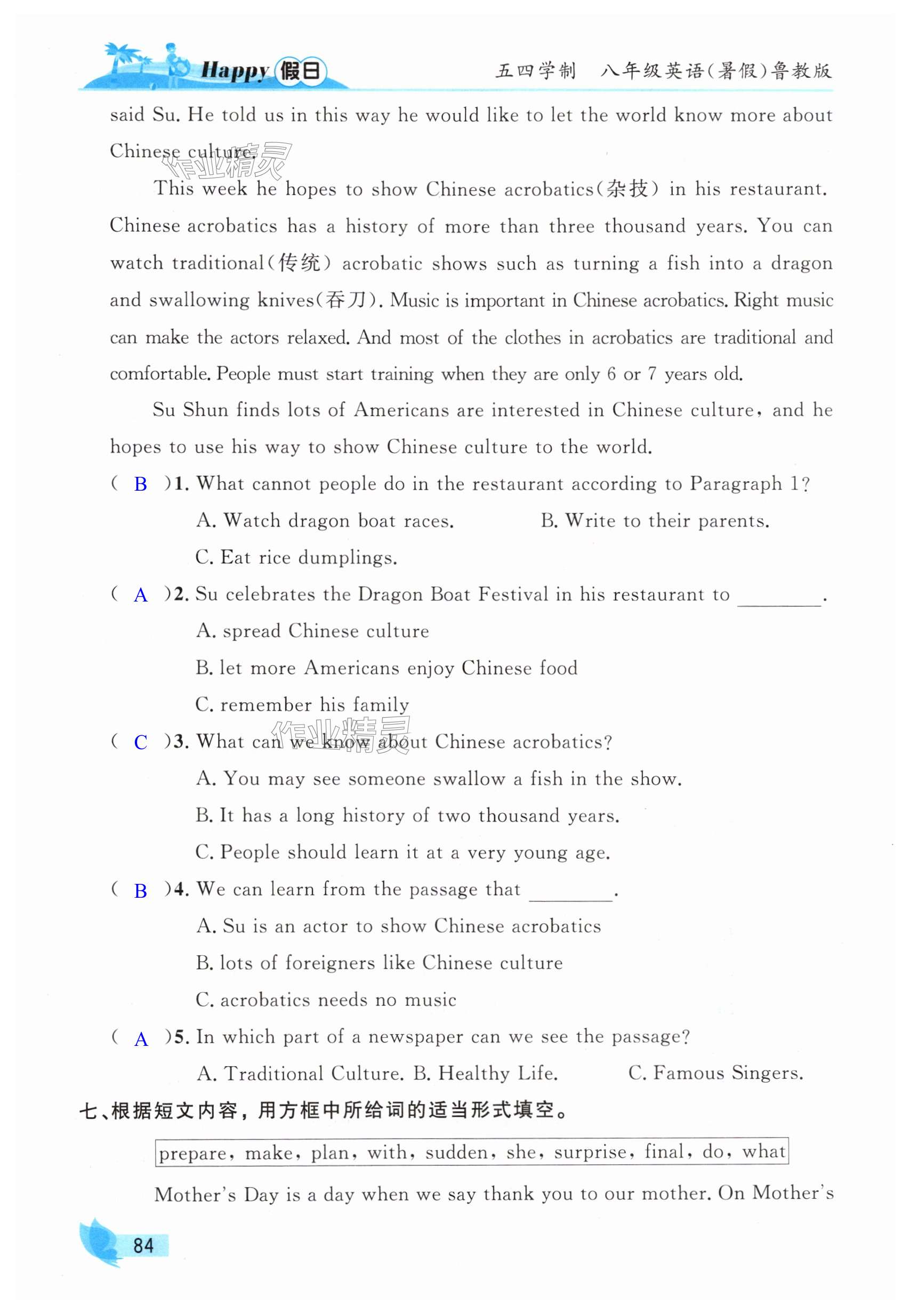 注:目前有些书本章节名称可能整理的还不是很完善,但都是按照顺序排列的,请同学们按照顺序仔细查找。练习册 2025年暑假Happy假日八年级英语鲁教版五四制 答案主要是用来给同学们做完题方便对答案用的,请勿直接抄袭。