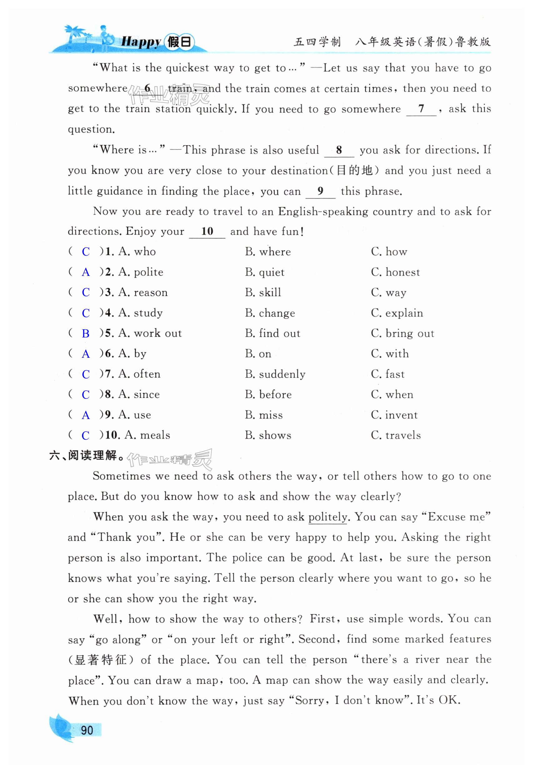 注:目前有些书本章节名称可能整理的还不是很完善,但都是按照顺序排列的,请同学们按照顺序仔细查找。练习册 2025年暑假Happy假日八年级英语鲁教版五四制 答案主要是用来给同学们做完题方便对答案用的,请勿直接抄袭。