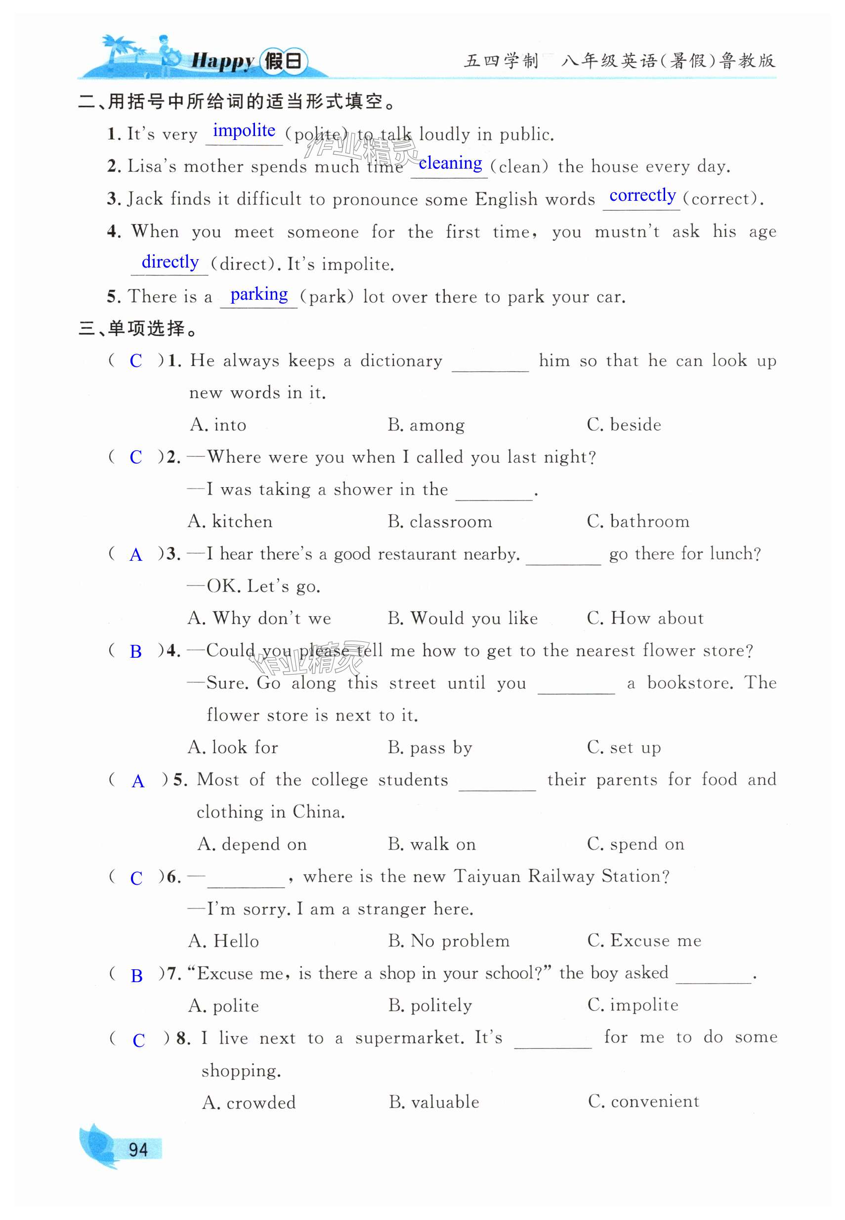 注:目前有些书本章节名称可能整理的还不是很完善,但都是按照顺序排列的,请同学们按照顺序仔细查找。练习册 2025年暑假Happy假日八年级英语鲁教版五四制 答案主要是用来给同学们做完题方便对答案用的,请勿直接抄袭。