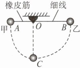 14. 如图所示,完全相同的甲、乙两球分别由橡皮筋OA和无弹细线OB系于O点,$(OA<OB$,先后从水平位置由静止开始释放,不计空气阻力)两球到达O点正下方C点时,橡皮筋与细线长度恰好相等。下摆过程中,乙球的____能转化为____能,两球下落到C点的过程中重力做功分别为$W_{甲}$、$W_{乙}$,两球在C点时的机械能分别为$E_{甲}$、$E_{乙}$,则它们的大小关系为$W_{甲}$____$W_{乙}$,$E_{甲}$____$E_{乙}$。